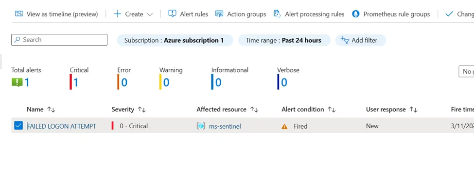 4. After performing some intentional logon attempts on my remote desktop, I saw the alert trigger and appear in Azure Monitor.