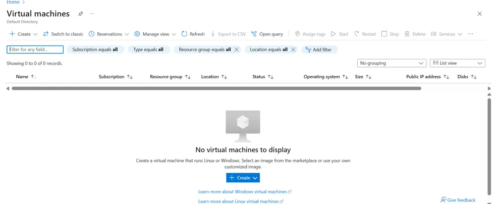Creating Virtual Machines: Go to the Azure portal at portal.azure.com and search for “Virtual Machine.” You’ll be presented with the screen shown below.